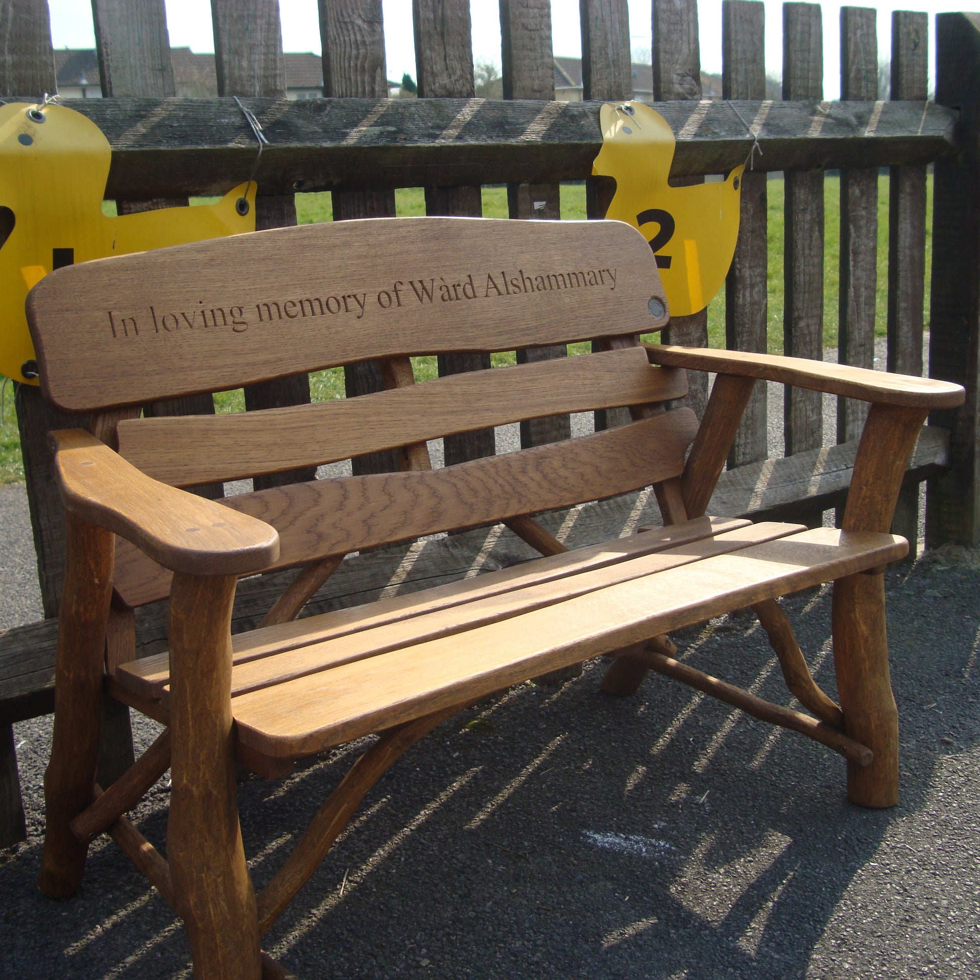 One engraved inscription is included in the price of your memorial bench. You have a choice of a computer controlled engraving direct into the top rail of the bench, brass plaque or laminate plaque. The maximum number of carved letters for this bench is 13 characters per line (including spaces), this bench can accomodate 3 lines. Please contact us if your text is longer. Examples wood engraving can be seen in the bench portfolio section. We can offer you advice on the engraving which best suits your memorial bench, find our more